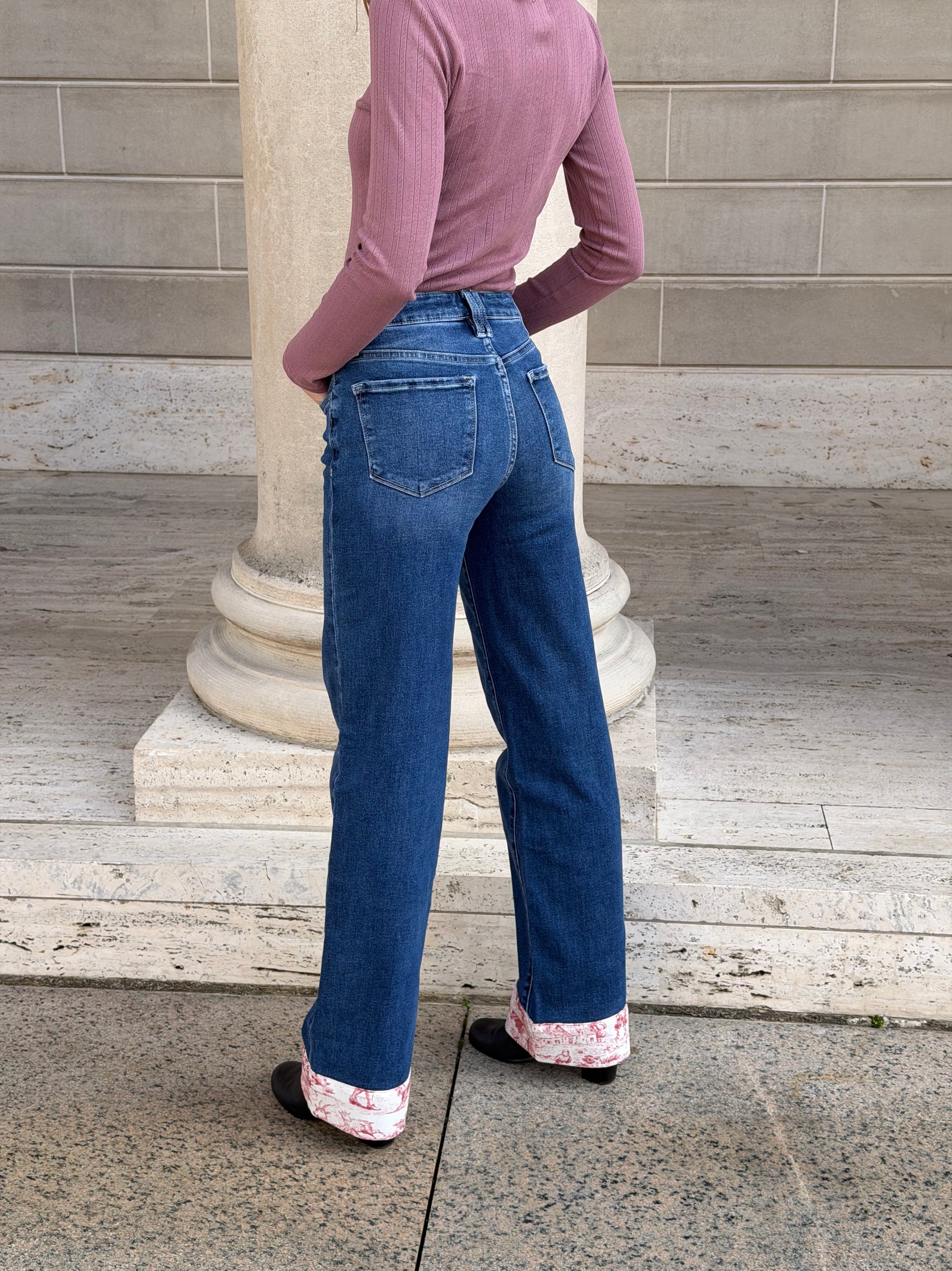 Elevate your wardrobe with the Wide Leg Jean in Cherry Toile—a high-rise, full-length stretch denim style designed for comfort and sophistication. The hem features an upcycled cherry-red cotton toile detail, adding a feminine and distinctive finish. Perfect for everyday wear, these statement jeans pair beautifully with a red or white blouse or top for a bold, coordinated look.